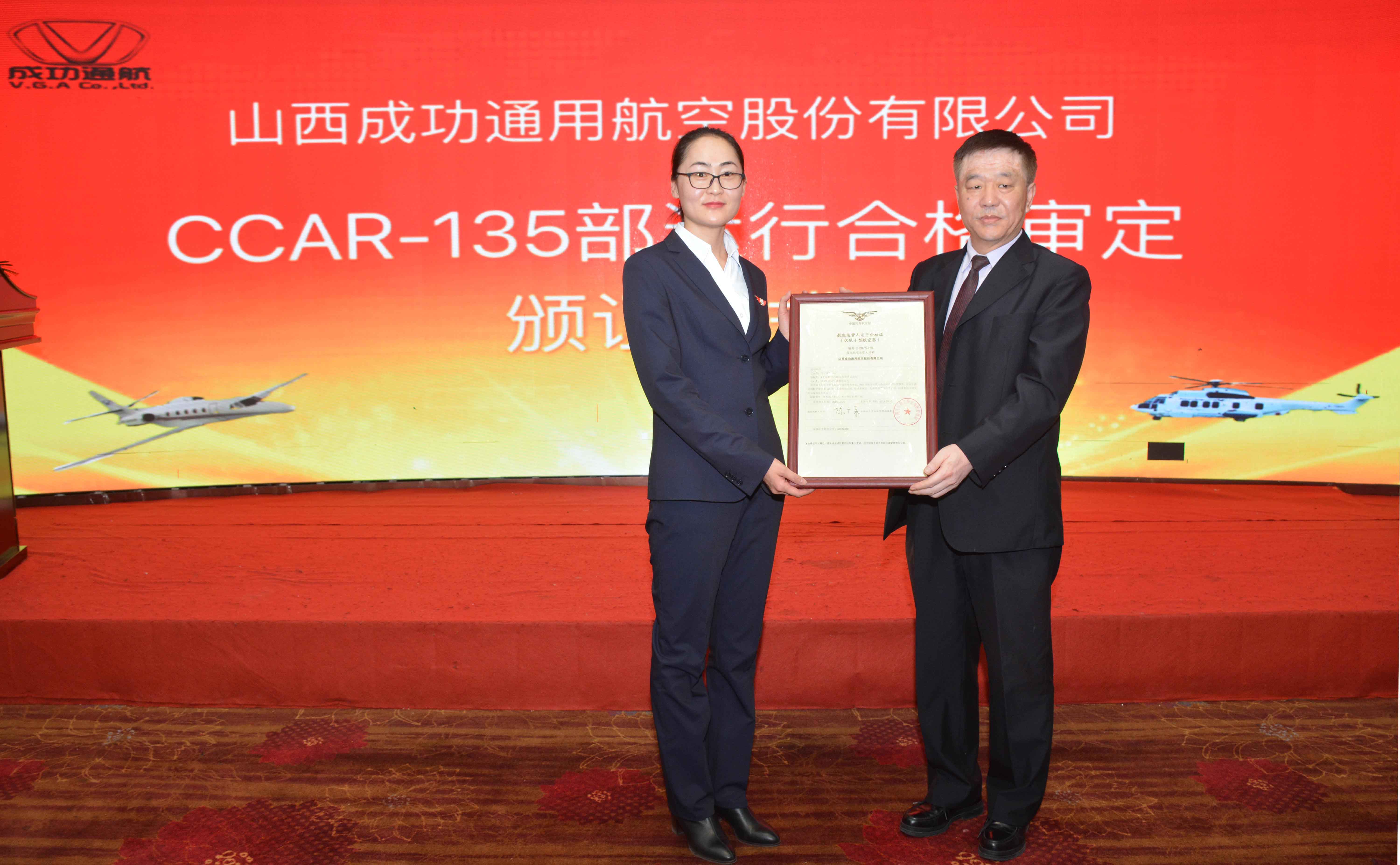 CCAR-135部《小型航空器商业运输运营人运行合格审定规则》,指小型航空器航空运营人载客及全货运运行合格标准,即具备通用航空短途客运资质。2019年8月份,成功通航紧紧抓住国家大力促进通用航空产业发展、山西省获批国家通用航空业发展示范省的历史机遇,认真落实省委、省政府制定的“示范区”、“排头兵”、“新高地”三大目标要求,根据“长治市通用航空产业发展规划(2019―2030 年)”,按长治市委、市政府的决策、规划和部署及“一核创新、两带牵引、三晋协同、多产并举”的通航发展战略思路,积极申请CCAR-135部资质,助推山西省通航短途运输。经过运行合格审定组半年多严格审定及验证飞行,成功通航运行组织严密、飞行器适航可靠、技术保障优良,经民航华北地区管理局和民航山西安全监督管理局审定,最终于2019年10月25日获得CCAR-135部“航空运营人运行合格证”,这在成功通航发展历程中具有里程碑的意义。