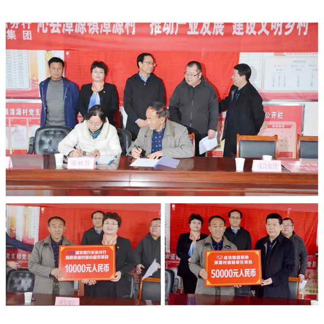 驻村工作队简要汇报了驻村扶贫工作之后,由山西成蹊博苑农业科技有限公司与漳源村签订了《矮化大樱桃树苗订购及种植服务协议》并举行了产业扶贫项目签约仪式和永利yl23411捐助漳源村道路硬化项目、浦发银行长治分行爱心超市捐助仪式。永利yl23411党委书记陈建法、浦发银行长治分行副行长李亚玲分别代表爱心捐助企业发言。