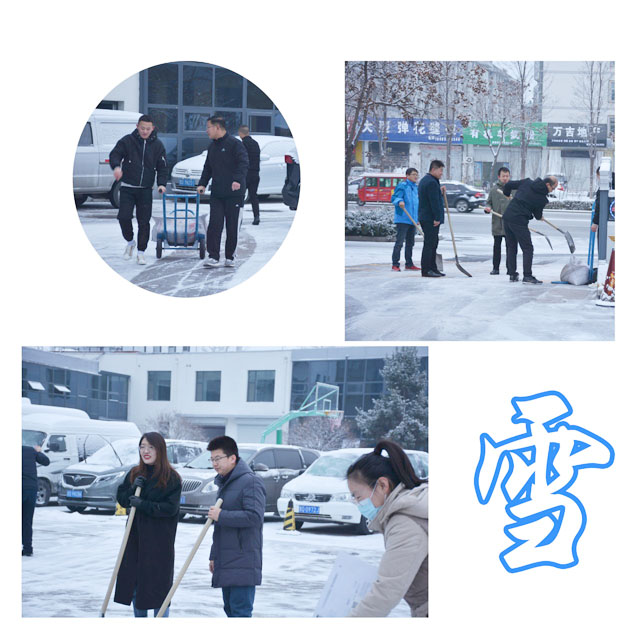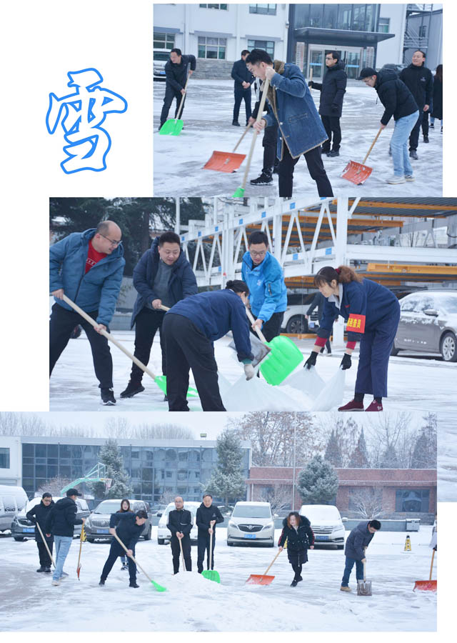 昨日到今天凌晨的这场雪,也算是今年的第三场降雪,这场喜雪再一次滋润了万物,亲吻了大地,使一度的干燥变得更加清爽怡人。然而,由于寒冷将融解的雪水结成了冰,加之,冰上覆盖的厚雪形成了光滑的路面,自然给人们的出行造成了极大的不便。集团综合部挑头组织这次清雪作业,总部各职能部门、成功煤炭、成功通航工作人员“一个也不拉”地迅速投入了这场清雪作业。集团党委书记陈建法、总裁助理狄国文放下手头的事情亲自参与此次清雪作业。虽然,天气比较寒冷,但总部各职能部门、成功煤炭、成功通航工作人员悉数参加,无论男职员,还是女职员,无论是部门负责人,还是业务主管,在清雪作业过程中都是普通的成功人,他们有的拿铁锨,有的拿扫帚,还有的借上现代除雪车,不惧寒冷,不怕手冻,干起活来一点也不推让,整个清雪作业场面显得就像“一家人”似的,合奏着一曲“团结、温馨”的凯歌。特别是整个清雪作业过程井然有序,热火朝天,干劲十足,经过将近一个多小时的全力作业,积雪被清理的干干净净,约200平米的总部大院褪去了皑皑的绒毯,恢复了原有的容貌,所有参与清雪作业的人脸上展露出了欣慰的笑容。