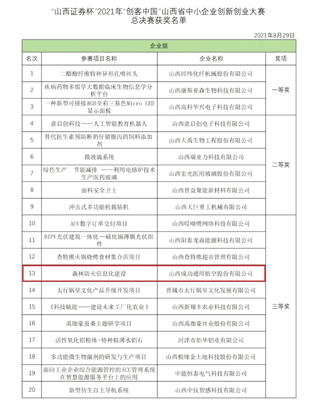成功通航《森林防火管理平台》项目继7月21日荣获2021年“创客中国”长治市“高新区杯”中小企业创新创业大赛企业组第三名之后, 8月28日,在“山西证券杯”2021年“创客中国”山西省中小企业创新创业大赛中再次获得总决赛三等奖。