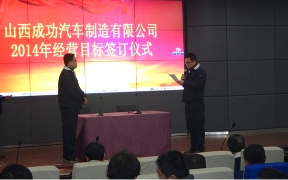 为落实集团、事业部下达的2014年度山西成功汽车制造有限公司经营指标,成功汽车于2014年1月21日,在公司二楼报告厅举行2014年度经营目标责任书签订仪式。
