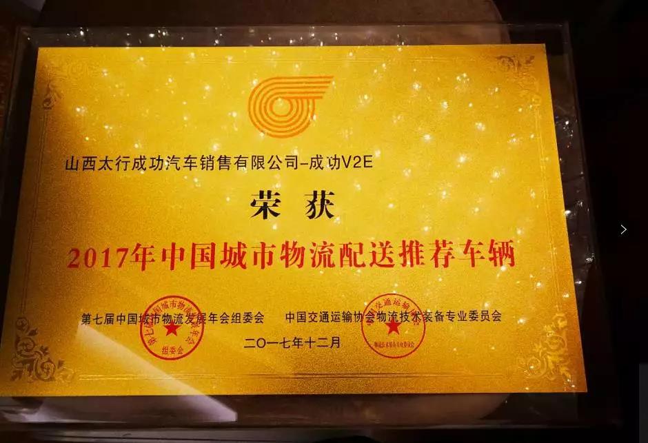 第七届中国城市物流发展年会在江西高安召开。成功汽车V2E获得“2017年中国城市物流配送推荐车辆”称号。近年来,成功汽车紧跟市场变化,不断提升自己产品和售后服务体系建设。在新能源领域提出了新能源整车产品3年10万,电池、电机、电控等关键零部件5年或20万公里超长质保政策。建立了标准化的售后服务管理体系,通过加强人员培训、服务渠道建设提升服务能力。