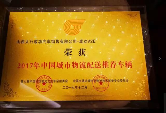 21日晚,在中国交通运输协会第七届城市物流发展年会颁奖及欢迎晚宴上山西太行成功汽车销售有限公司―成功V2E凭借极高的产品品质、良好的市场口碑等诸多方面的优势,被授予"2017年中国城市物流配送推荐车辆"荣誉称号。