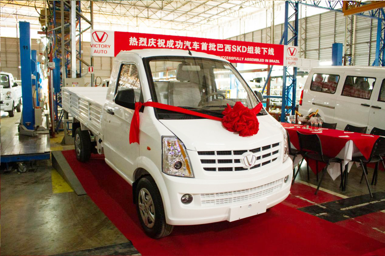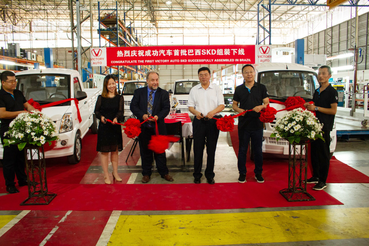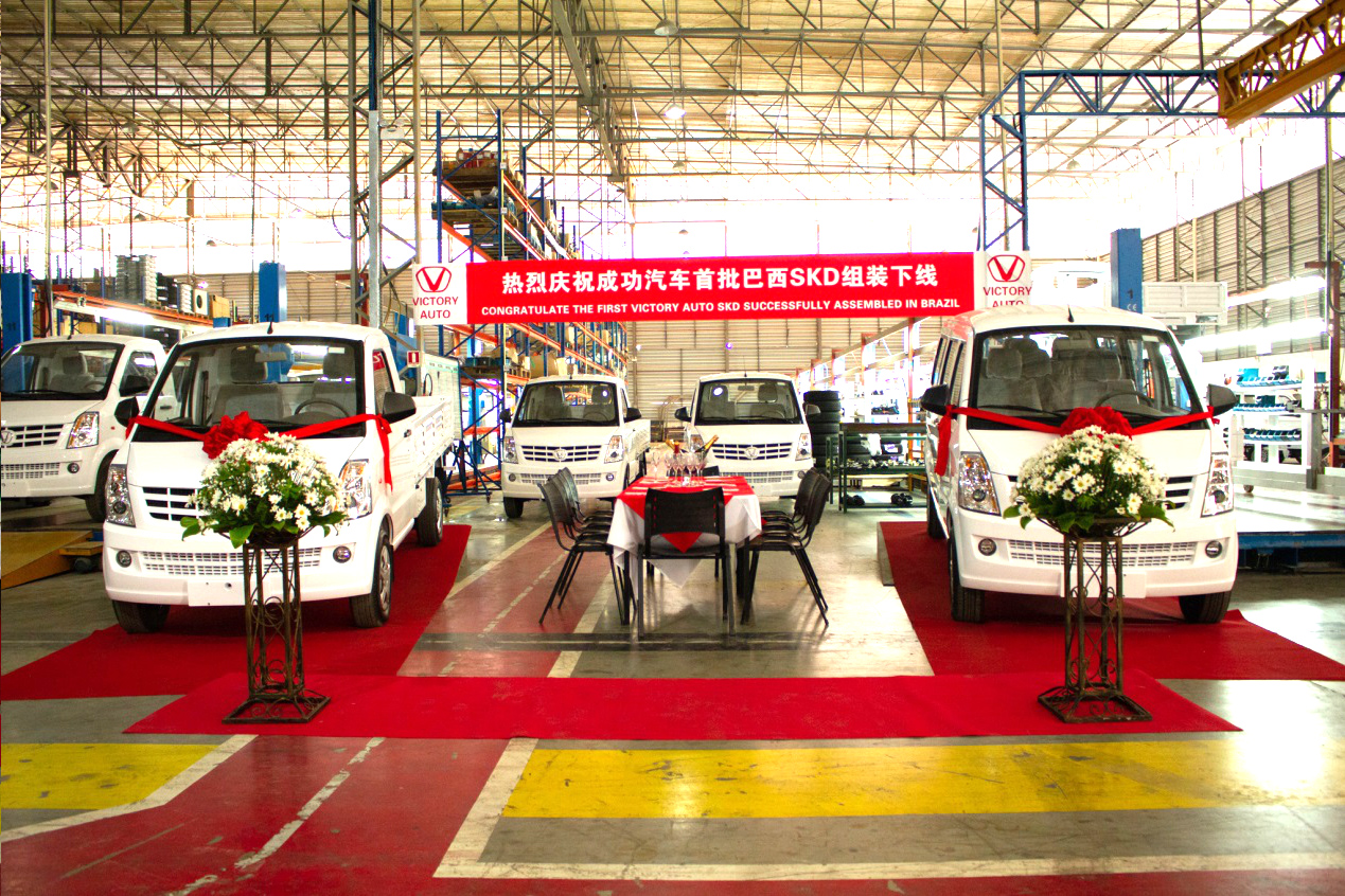 “成功布局”是集团五年发展规划重要的组成部分,“海外建线”是成功汽车走向世界的战略目标之一。近年来,集团以国际国内市场为落脚点,积极采取“外拓内销”的方略,一手抓海外市场整车贸易出口和技术输出建线;一手抓国内市场成功新能源汽车销售和直营店布点。目前,成功汽车在南美巴西建成首家KD工厂,并实现首台新车下线。12月15日,在巴西KD工厂总装车间举行了首台K1、K2轻型卡车及6430乘用车下线仪式,集团总裁马国利、汽车事业部副总经理张莹莹、北京易驰总经理李欣和巴西组装工厂总裁为新车下线仪式剪彩,正式掀开了成功汽车“海外”组装的序幕。