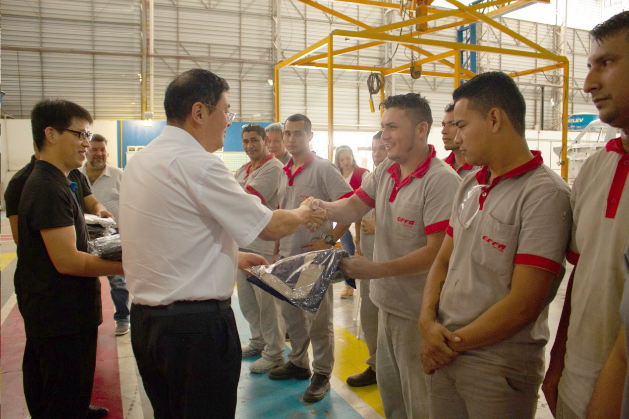 永利yl23411总裁马国利先生为巴西组装厂工人赠送成功汽车工作服