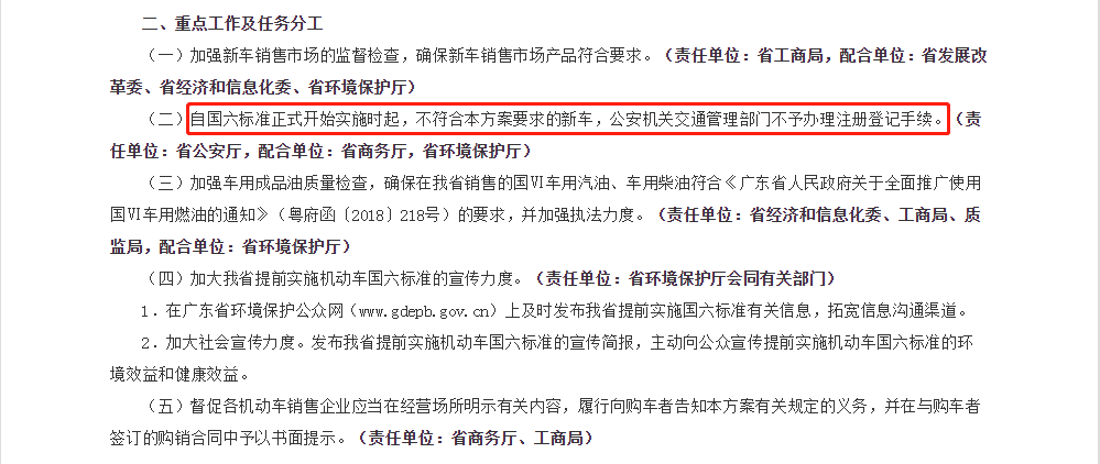 根据《广东省提前实施机动车国六排放标准方案(征求意见稿)》的要求,广东省将于2019年7月1日起,对省内销售、注册登记的轻型汽车新车按照国六标准的排放控制要求进行监管,不符合方案要求的新车,公安机关交通管理部门将不予办理注册登记手续。